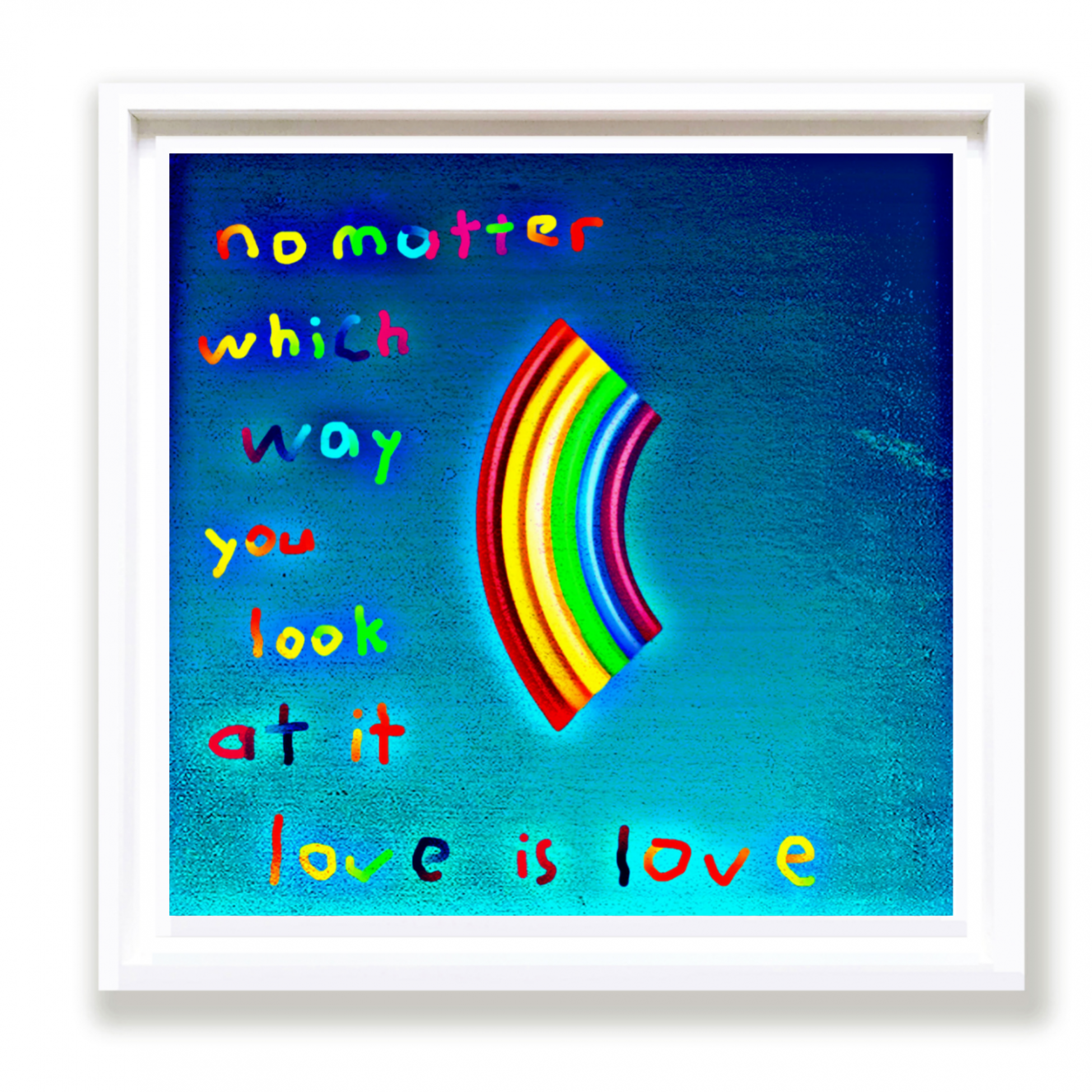 Rainbow words light up the sky alongside detailed emoji-like images accompanying them. These works express a child-like love of life that all of us can do with remembering sometimes.